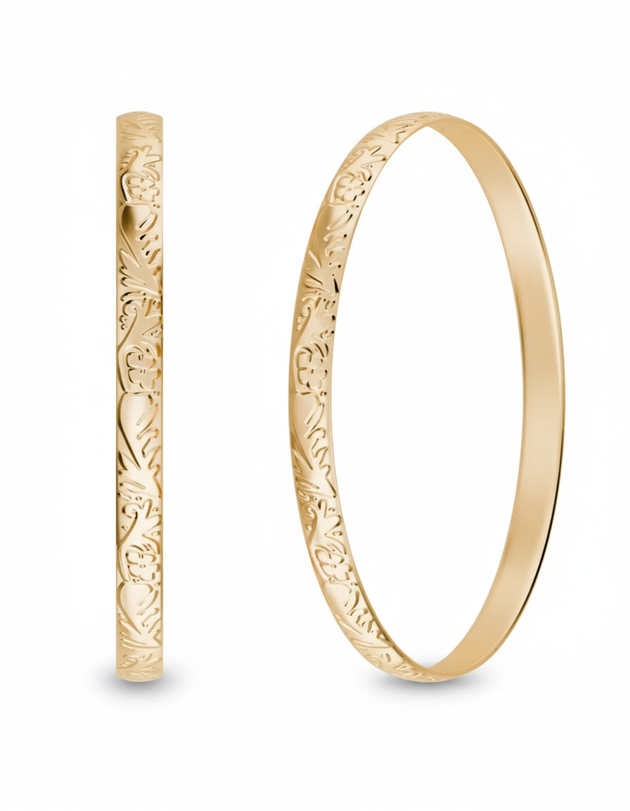 This floral bangle feels like a treasure from another time. Wrapped in a hand-carved pattern and finished in gold or silver, it’s a nod to heirloom pieces passed from mother to daughter. Stack it, gift it, or wear it daily as a quiet statement of beauty that lasts.