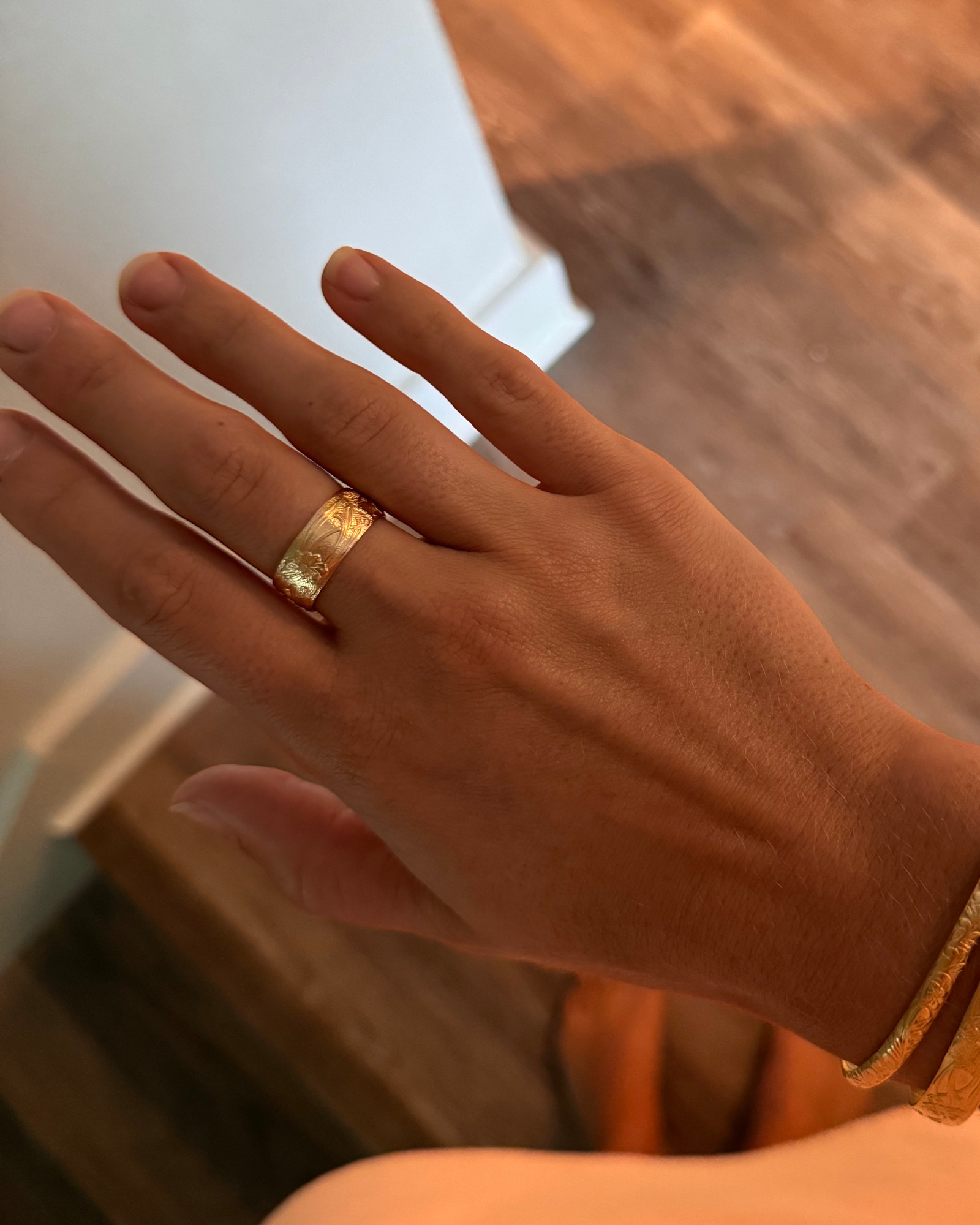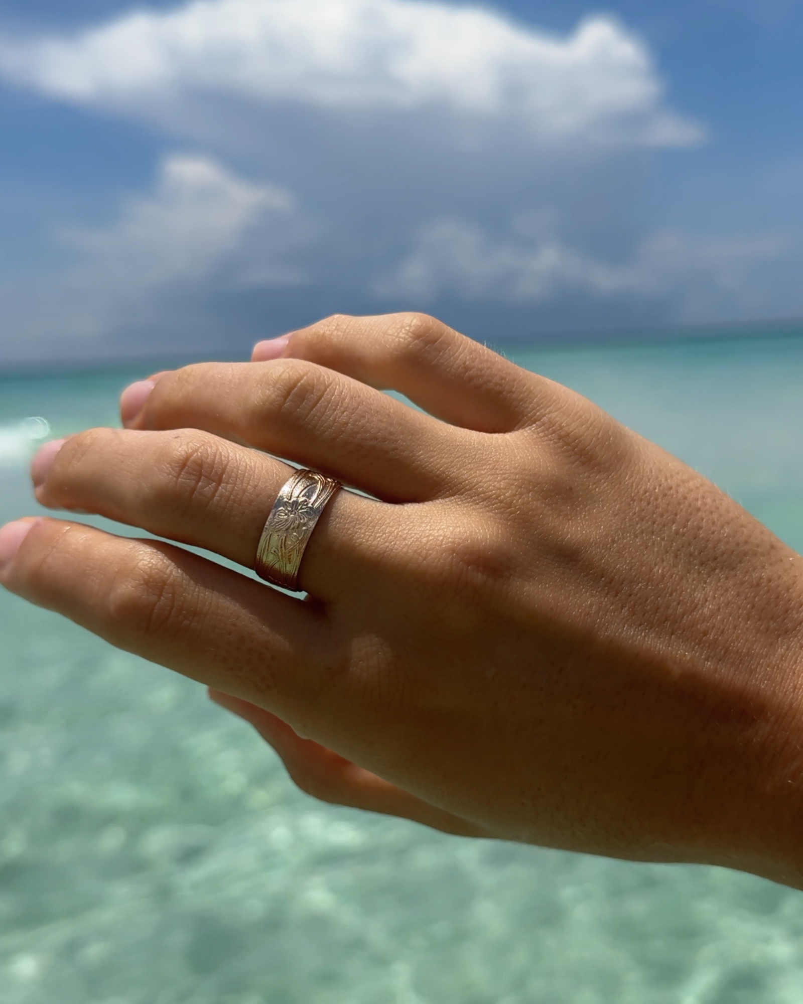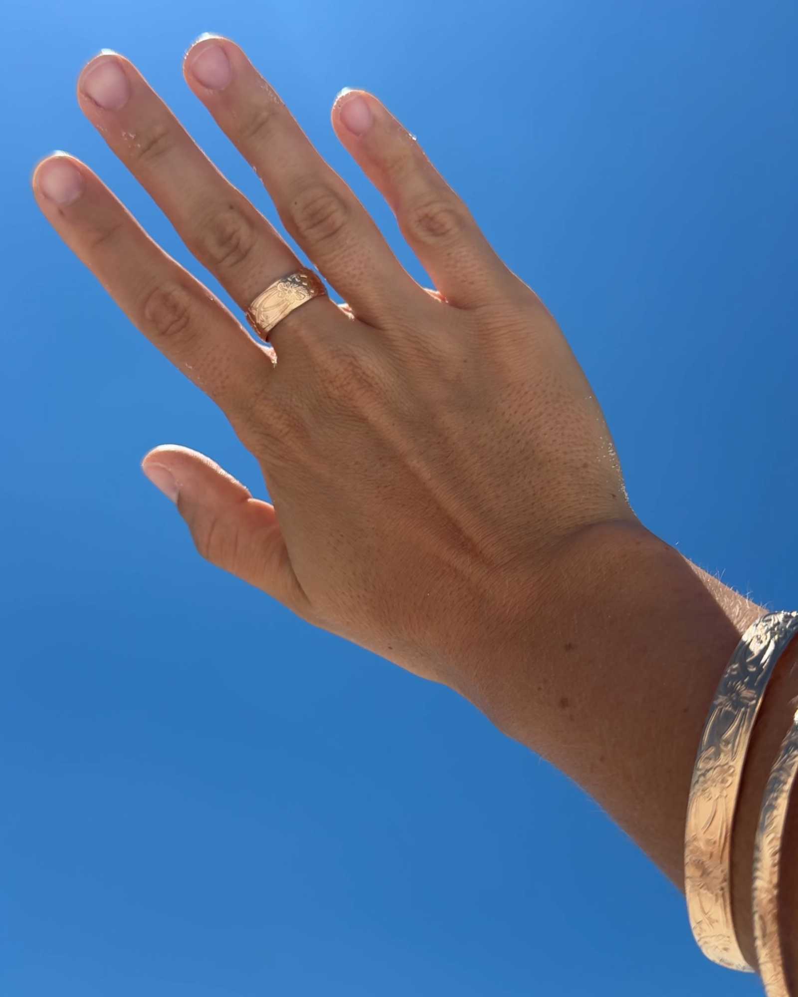 Inspired by our signature floral pattern, this bold ring brings our carved motif to a comfortable design you'll wear every day. Weighty yet easy to wear, it makes a striking statement on its own or stacked with your favorites.