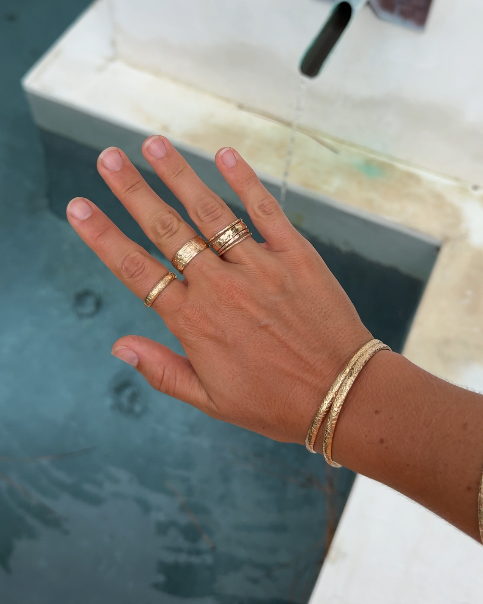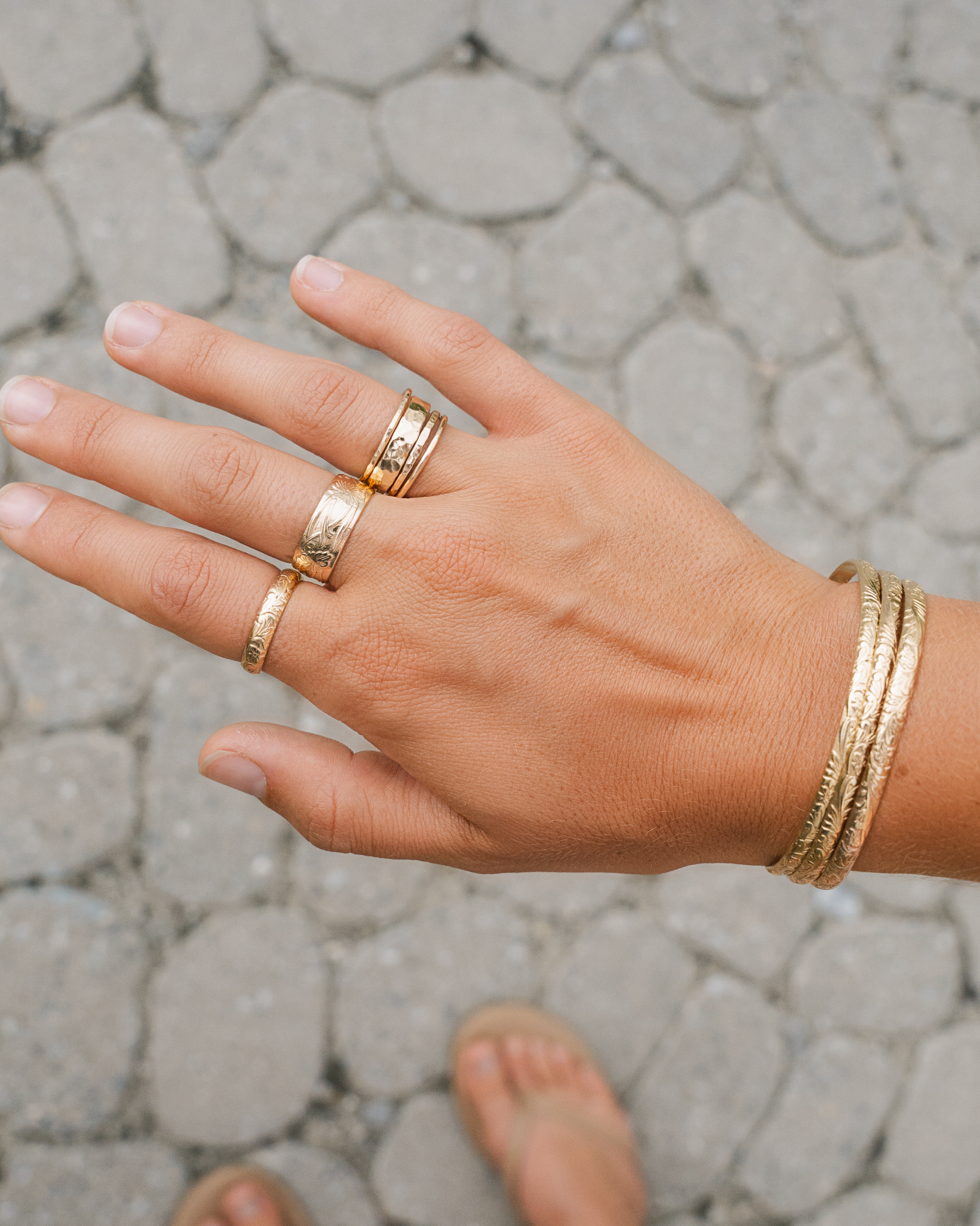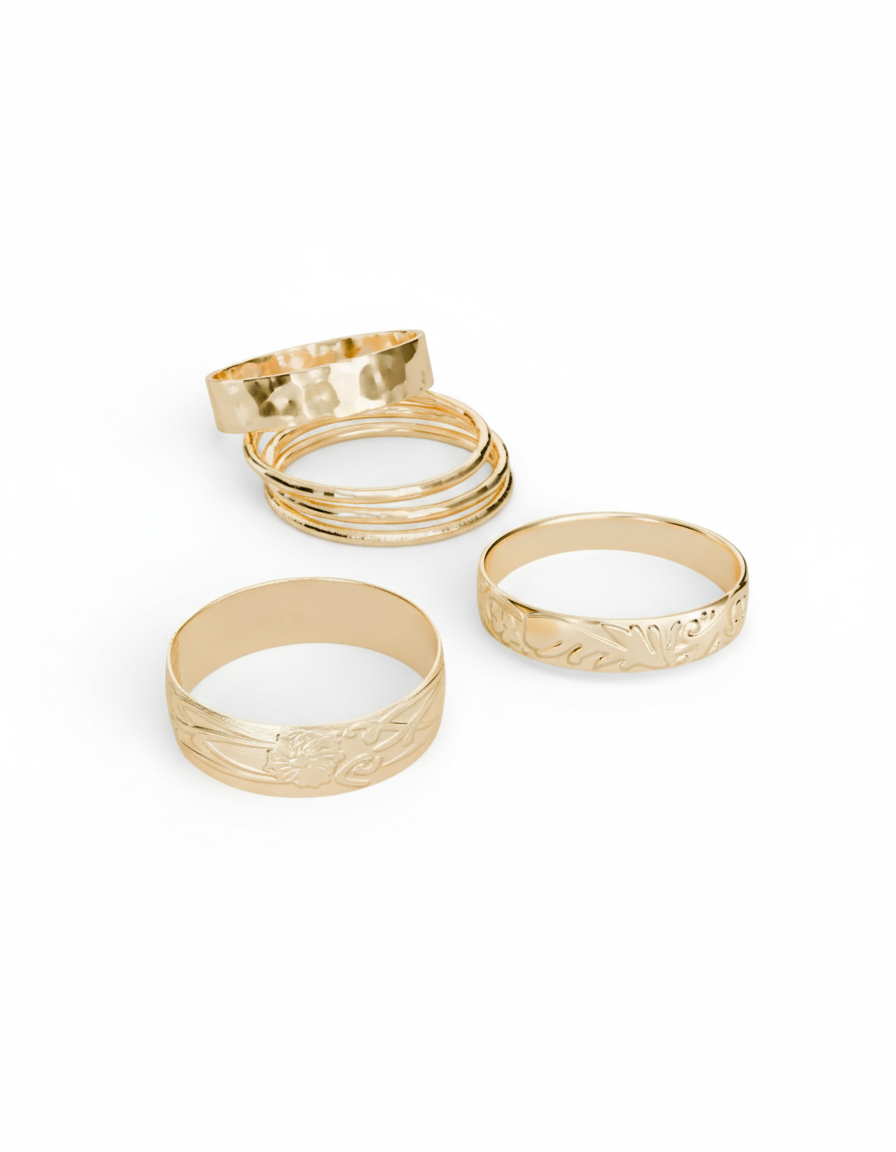 Meet your golden trio—styled to shine together or stand strong on their own. This curated set features our Eden Ring, Floral Ring, and Sunshine Stack—each designed with its own texture and movement. Wear them together for a bold look or solo for everyday elegance.